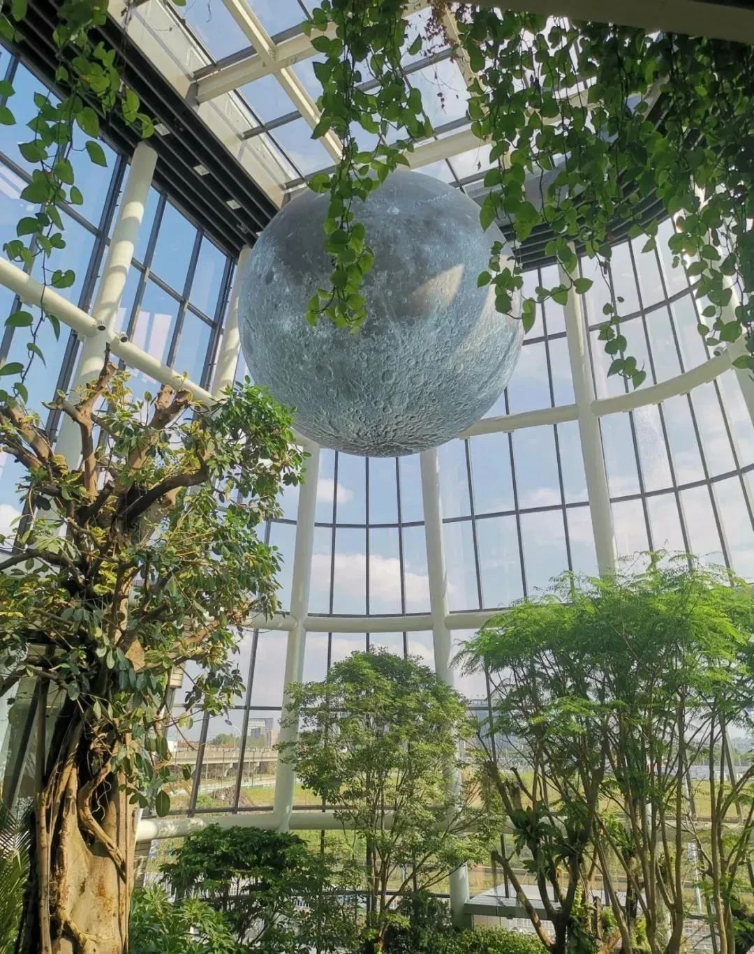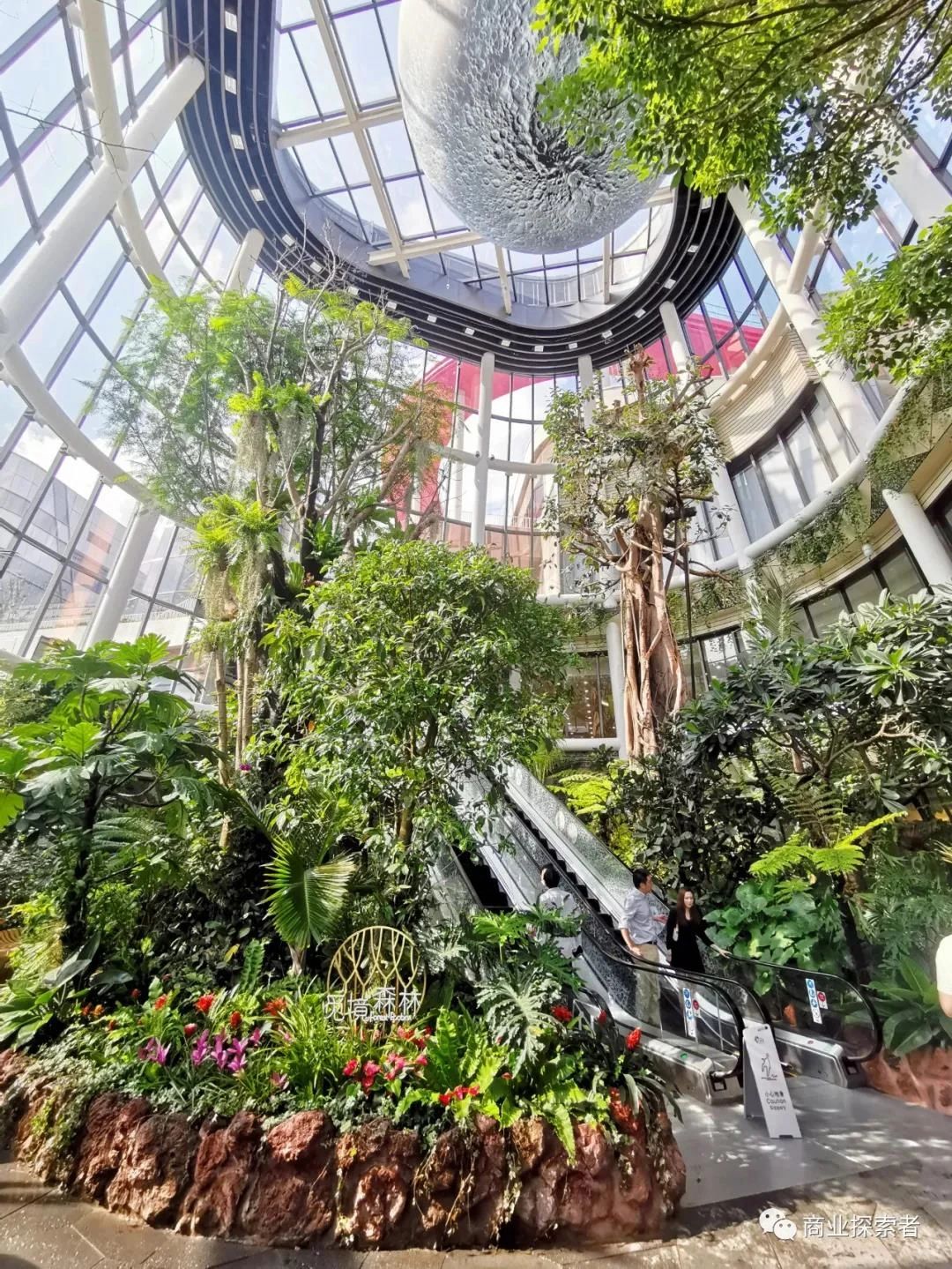 200余株热带植物自然生长,14.5米高的高山榕拔地而起,商场被梯田状的绿色植被环抱,形成独特的“退台花园”,为消费者塑造了一个游离于城市之上的自然绿洲,成为都市人近在咫尺的世外桃园。卢克·杰拉姆设计的“超级月亮”由月球的图像和灯光共同组成。“月球”按照美国NASA数据进行原样制作,直径六米的月球,与真实的月球表面几乎一致。