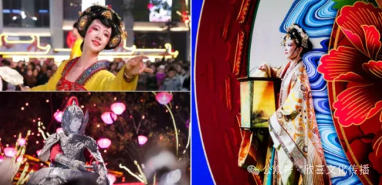 此外,街区文化为核,结合城市文化,引进国际一流团队创排《再回长安》《大雁塔水舞光影秀》两大演艺;街区常年不间断开展多组音乐表演、彩车巡游、秦腔小舞台等,“不倒翁小姐姐”“诗仙李白”等行为艺术先后爆火出圈,新推出的“盛唐密盒”演出将传统演艺模式从“台下观看”切换到“沉浸互动体验”,以全新形式焕活传统文化,受到了全国各地游客喜爱,在全网迅速爆红。