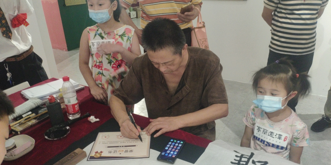 笔会环节中,武汉书法家协会主席万军,为长卷提字“祈福中国”;现场书画笔会,泽远·兰亭书院的学员与书画艺术大师行了面对面的交流。现场有国家1级书画家吴宝林、武汉书法家协会主席万军、叶画非遗传承人刘义桥老师等书画界大师给泽远·兰亭书院的学员进行耐心点评和指导,并颁发荣誉证书,给予了学员莫大的鼓励。通过活动体现泽远·兰亭书院的办学宗旨——唯美书法,传承国学。