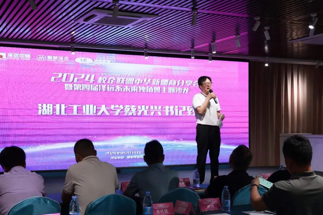 2024年9月7日14时48分,活动正式开始,原湖北工业大学党委副书记、校企联盟顾问蔡光兴先生首先讲话,接着泽远中国集团董事长蔡康先生代表主办方致辞。聚梦泽远联合创始人、总经理王松峰主讲的《数字发展战略全天候合作体系》,如同一把钥匙,开启了数字领域机遇与合作的探索之门。校企联盟总组委会主任、新儒商文化创始人万守杰博士分享《中华新儒商之道》,通过对“商”“商人”渊源进行了深入分析,推论出“商”与“儒”结合的文化逻辑,指出惟新儒商才是中国商人未来之路,同时给出了新儒商修行之路径及其方法,与会嘉宾深受启发。中国公车改革第一人、著名经济学家叶青教授的分享紧扣时代脉搏,阐述三中全会带来的新质生产力、战略腹地等五个商机,还剖析了胖东来的商业模式,为企业家们提供了极具价值的参考。