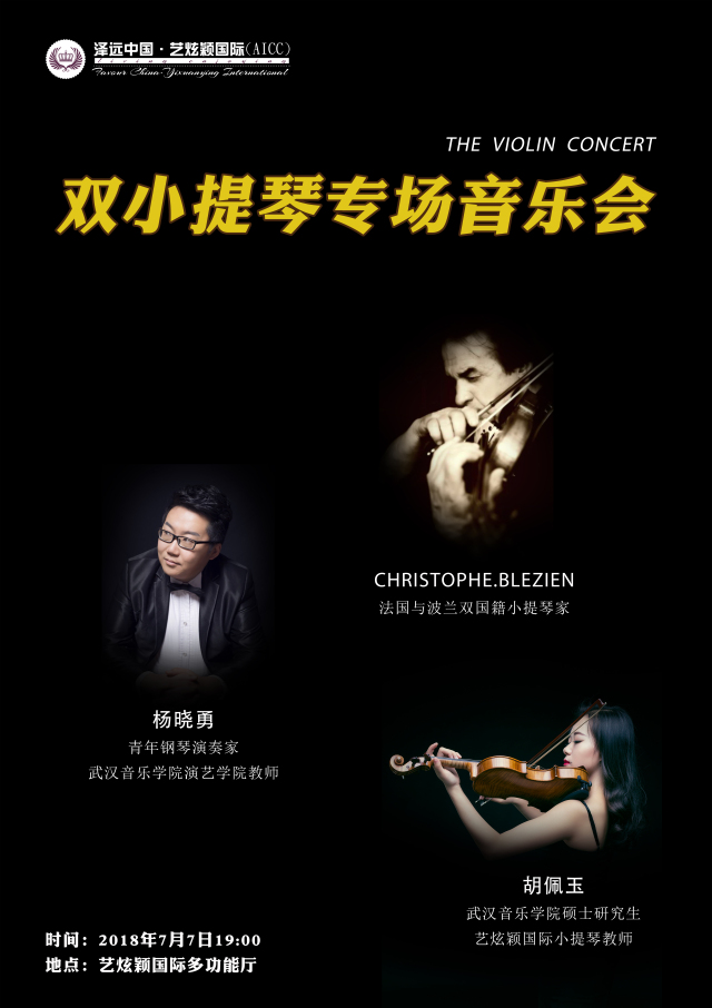 2018年7月7日19:00,艺炫颖国际诚邀波兰 &法国小提琴家Christophe Blezien 、青年钢琴演奏家杨晓勇与艺炫颖国际小提琴教师胡佩玉于艺炫颖国际后湖校区多功能厅共同举办“双小提琴专场公益音乐会”,欢迎您的莅临!