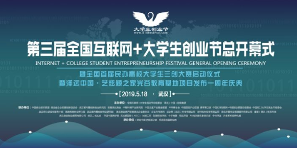第三届全国互联网+大学生创业节总开幕式暨全国首届民办高校大学生三创大赛启动仪式暨泽远中国•艺炫颖之家光谷教育基地一周年庆典,即将于2019年5月18日在中国光谷泽远中国•艺炫颖之家隆重举行!本次活动由第三届全国互联网+大学生创业节总组委会及泽远(中国)控股集团有限公司共同主办,艺炫颖之家总承办。