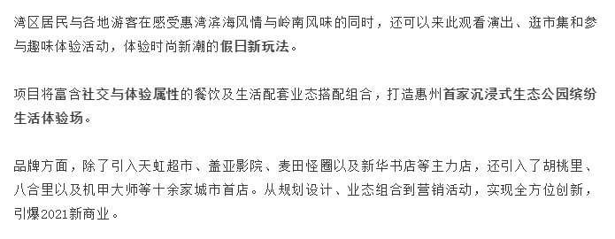 历经2020年的“洗礼”,商业市场加速升级,2021年4月30日,年度新商业代表作之一,惠州翡翠山·益田Holiday Park如期开业。