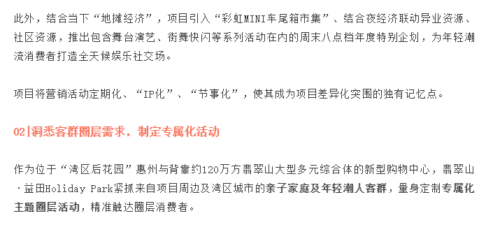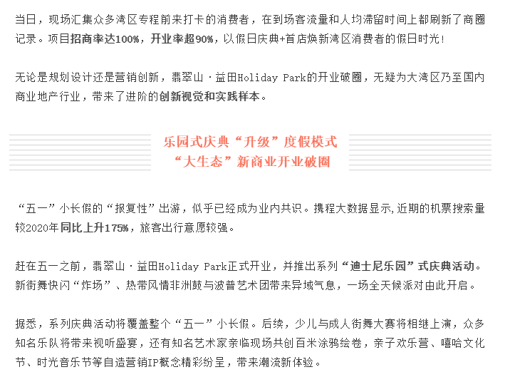 至此,通过创新定位、精准洞悉客群需求及赋能商户,“满分营销三部曲”于翡翠山·益田Holiday Park实现完美落地,从前期客群培育到开业“爆红”,项目的“软实力”通过创新营销策略得以直接展现,同时也为业内带来全新的营销思路。作为澳宏集团与深圳益田旅游商业集团(以下简称“益田”)共同输出的新商业作品,项目以澳宏集团的匠心精神进行设计打造,以益田旅游商业集团的独到理解进行精细运营。作为极具“匠心精神”的企业,澳宏集团在综合体项目硬件的设计打造上拥有着独特的理解与优势,升级大亚湾大道交通路网,并邀请国际知名公司Puri Lighting Design进行泛光照明设计,以国际视野与实力输出支持品质商业打造。同时,结合益田“项目搭台,商家唱戏”的精细化运营法则,项目依托区位优势,赋能商户围绕客群打造定制化专属活动,通过系列创新运营,加码项目成为引领惠州商业升级新样本。一直以来益田以“文化旅游+体验商业”的策略布局全国二十余城,成为行业领先的运营商之一。在翡翠山·益田Holiday Park项目上,同样秉承“新零售”、“新体验”、“新生活”运营理念,益田将“大生态商业模式”全新呈现。在新时期商业市场寻求升级方向时,翡翠山·益田Holiday Park结合项目独特的地理区位,通过全新的运营理念实现生态、文旅与现代商业的有机结合。同时,通过“不掉线”的创新营销,实现项目从筹备期“先声夺人”到“开业即爆”,为国内商业地产营销进阶提供了创新思路。从项目整体定位创新到营销创新,翡翠山·益田Holiday Park的案例,无疑是商业市场升级过程中不容错过的实践范本之一。