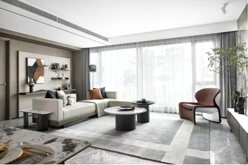 最为舒阔的152平方米四居户型,采用四叶草形式打造的大面宽设计最为亮眼。客厅拥有6米宽幕尺度,整体面宽达到12.6米,除了窗帘折叠部分遮挡较窄的墙体,窗户几乎占据了整个南向面宽。而主卧270°观景视野,也使得整个室内空间通透开阔,提升光照和观景效果,让居家的氛围更有品质。